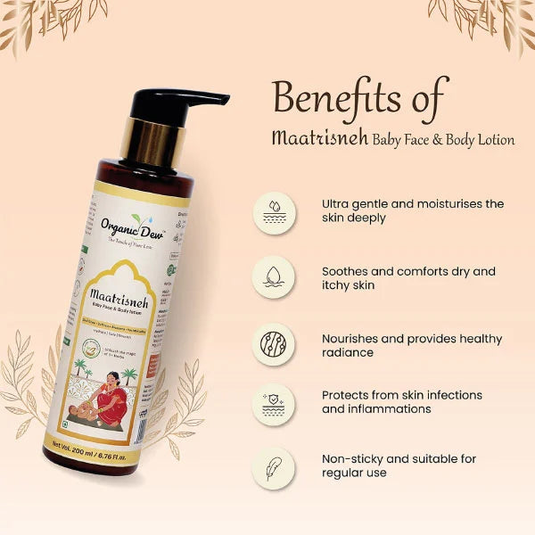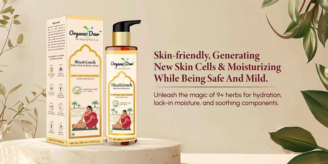 Our baby face & body lotion for newborns is an all-in-one product for your little one’s skin. Organic Dew bdoy lotion for babies provides moisture and hydration to the baby skin and keeping it safe from potential risks. With the power of 9+ herbs like aloe vera, rose, saffron, yashtimadhu, and beneficial traditional ingredients including desi ghee, wheat germ oil, cucumber, etc. coming together to provide complete newborn baby care.