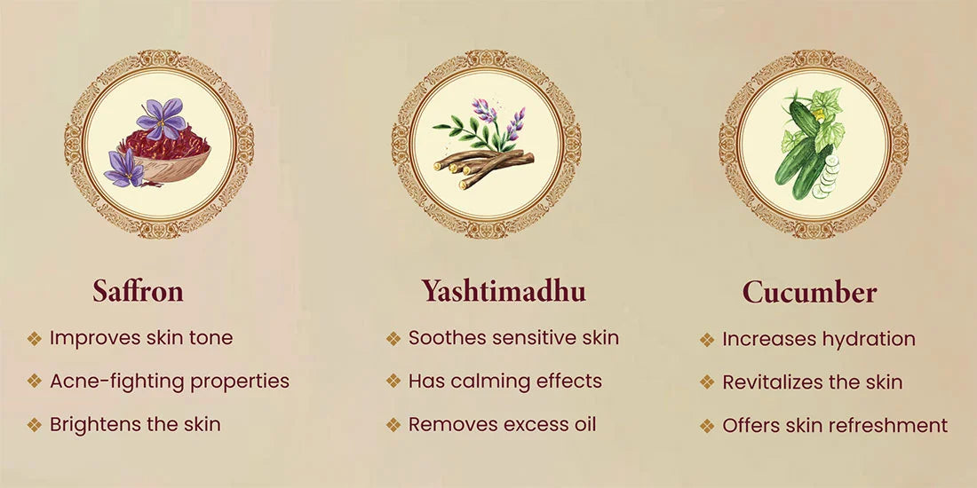 Desi Ghee, Aloe vera, Wheatgerm Oil, Almond Oil, Neem, Cucumber, Saffron Oil and Rose